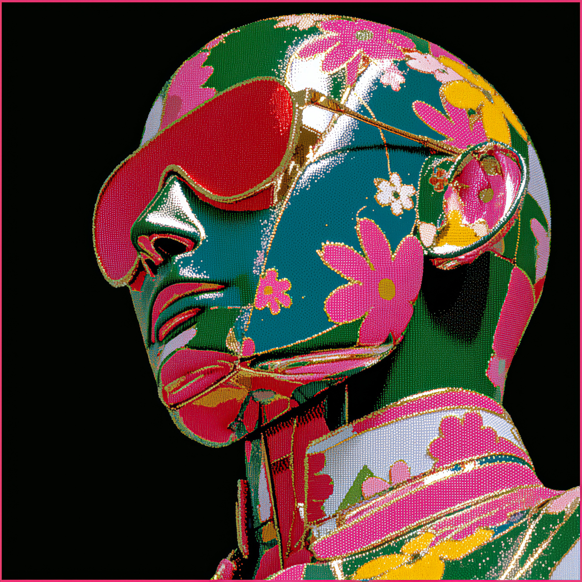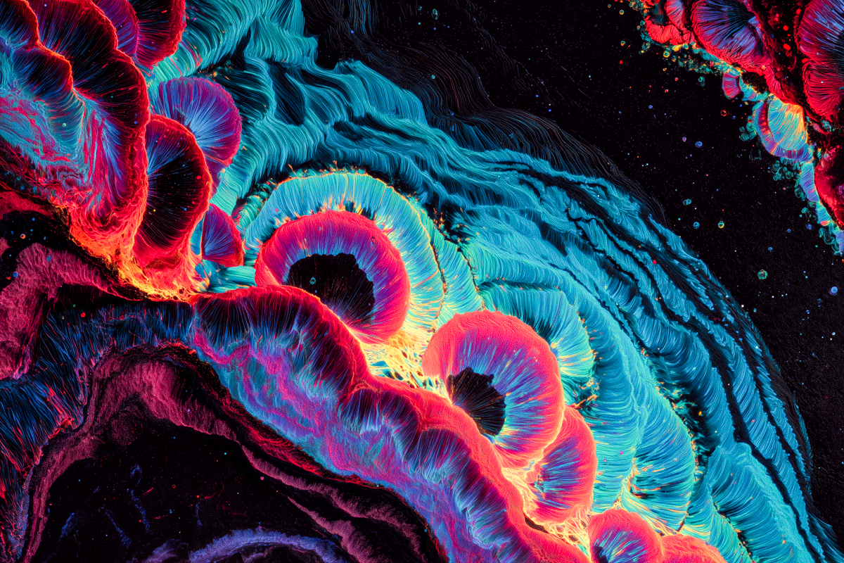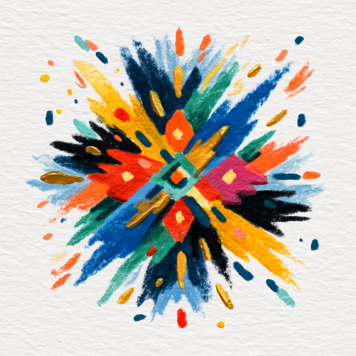 This vivid abstract work was created by Duncan Rawlinson using AI, capturing the raw force of color detonating outward from a tightly woven geometric center. Thick, textured brushstrokes in vermilion, cobalt, goldenrod, and magenta radiate like shrapnel across a cold-pressed paper ground, while metallic gold accents punctuate the chaos with moments of deliberate warmth. The composition balances explosive outward energy with an almost meditative diamond lattice at its core, suggesting tension between order and release. The mood is visceral and celebratory, equal parts controlled structure and uninhibited force.